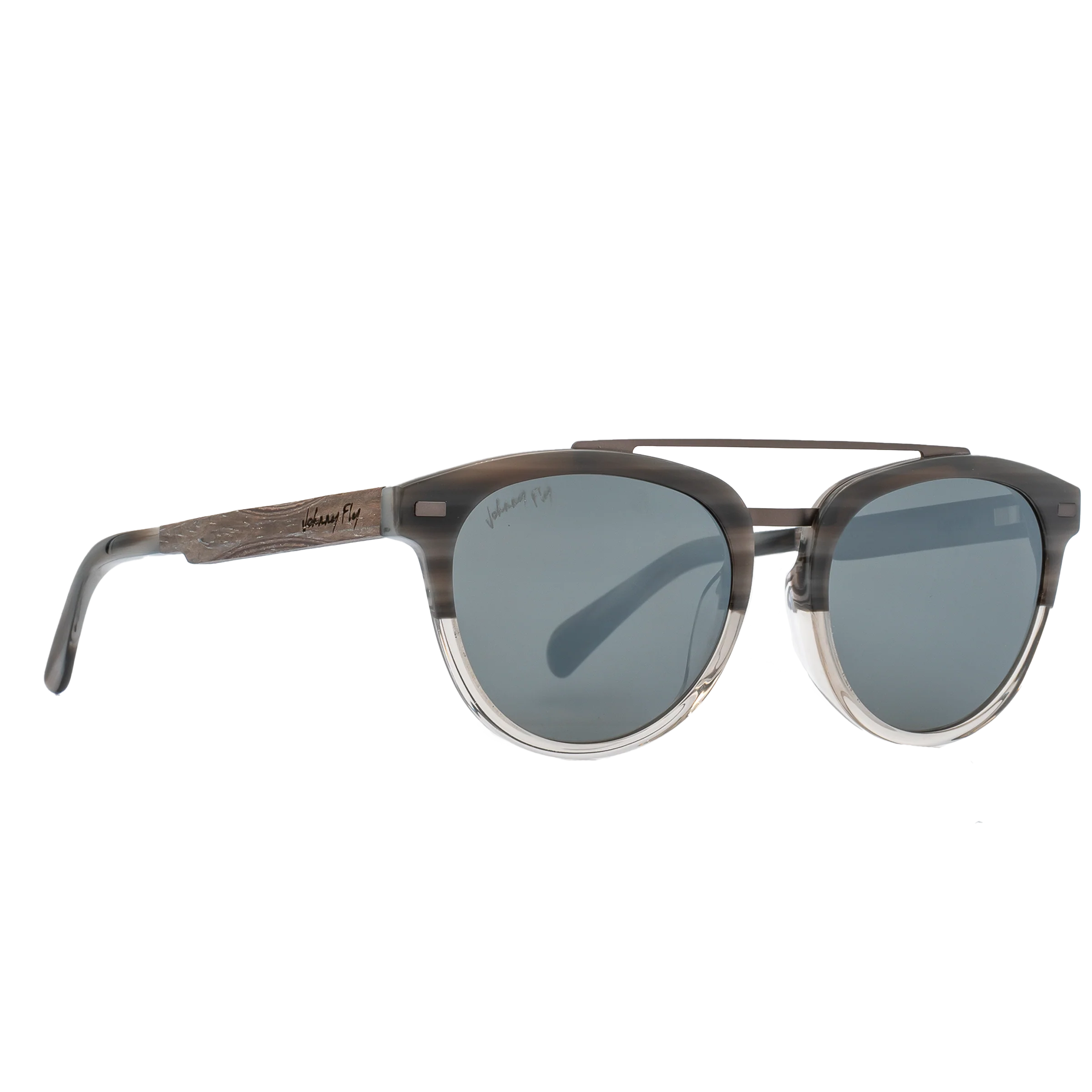 The Captain: A leader in style and technology. This model embodies the crossbar styles of yesterday while merging them with the iconic cotton acetate front section, wooden arms, spring hinges, and polarized lensing that make them Johnny Fly.
