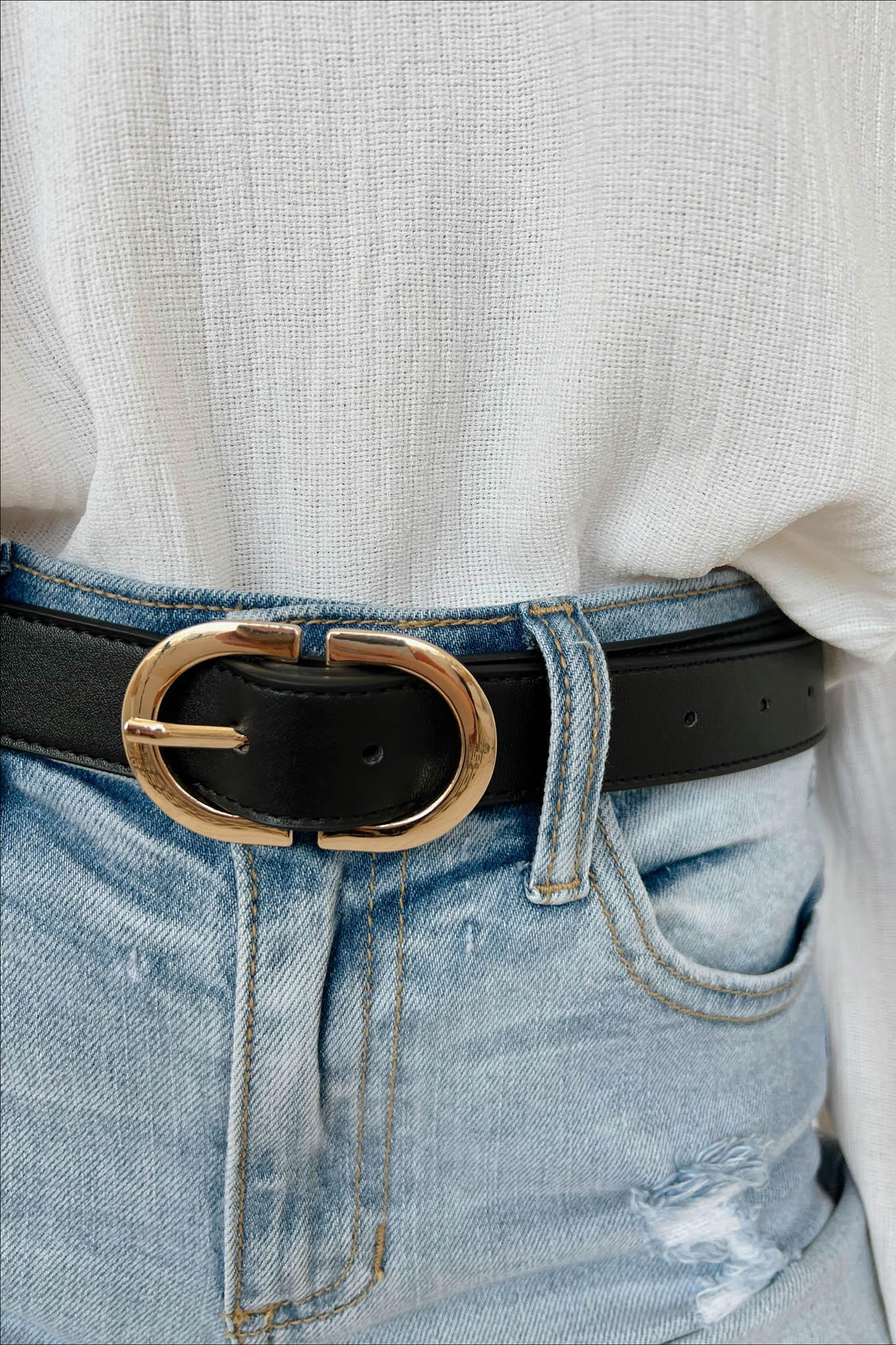 Looking for the perfect accessory to complete your outfit? You will love this simple and classically designed belt. It features a plain band with a gold tone oval belt buckle. Comes in black or dark brown. Measures 1.25" wide and 44" long.
