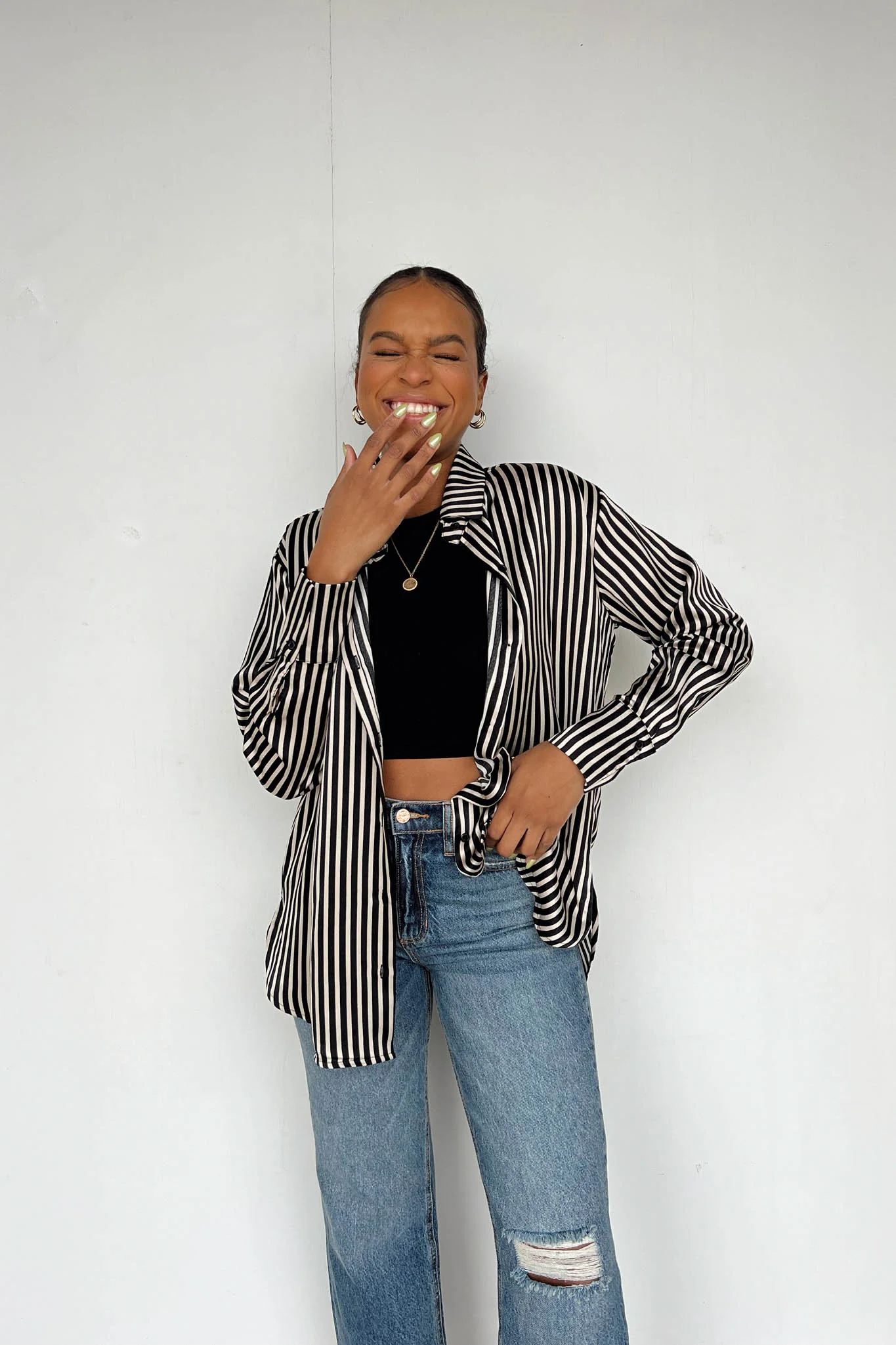 You can't go wrong adding this classic black and taupe striped button down to your wardrobe. It features an oversized, boyfriend style fit with a collared neckline, dropped shoulders, and loose long sleeves. Perfect for everyday wear, style with anything from a mini skirt to your favorite denim jeans or on trend wide leg trousers.