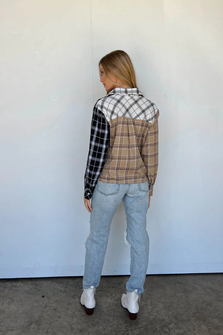This unique and stylish button down might just be our new favorite piece. It is perfect to throw on over your favorite jeans or Spanx. It features black, white, and brown plaid sections with buttons down the center and a pocket to one side over the chest. You'll want to add this one to cart immediately!