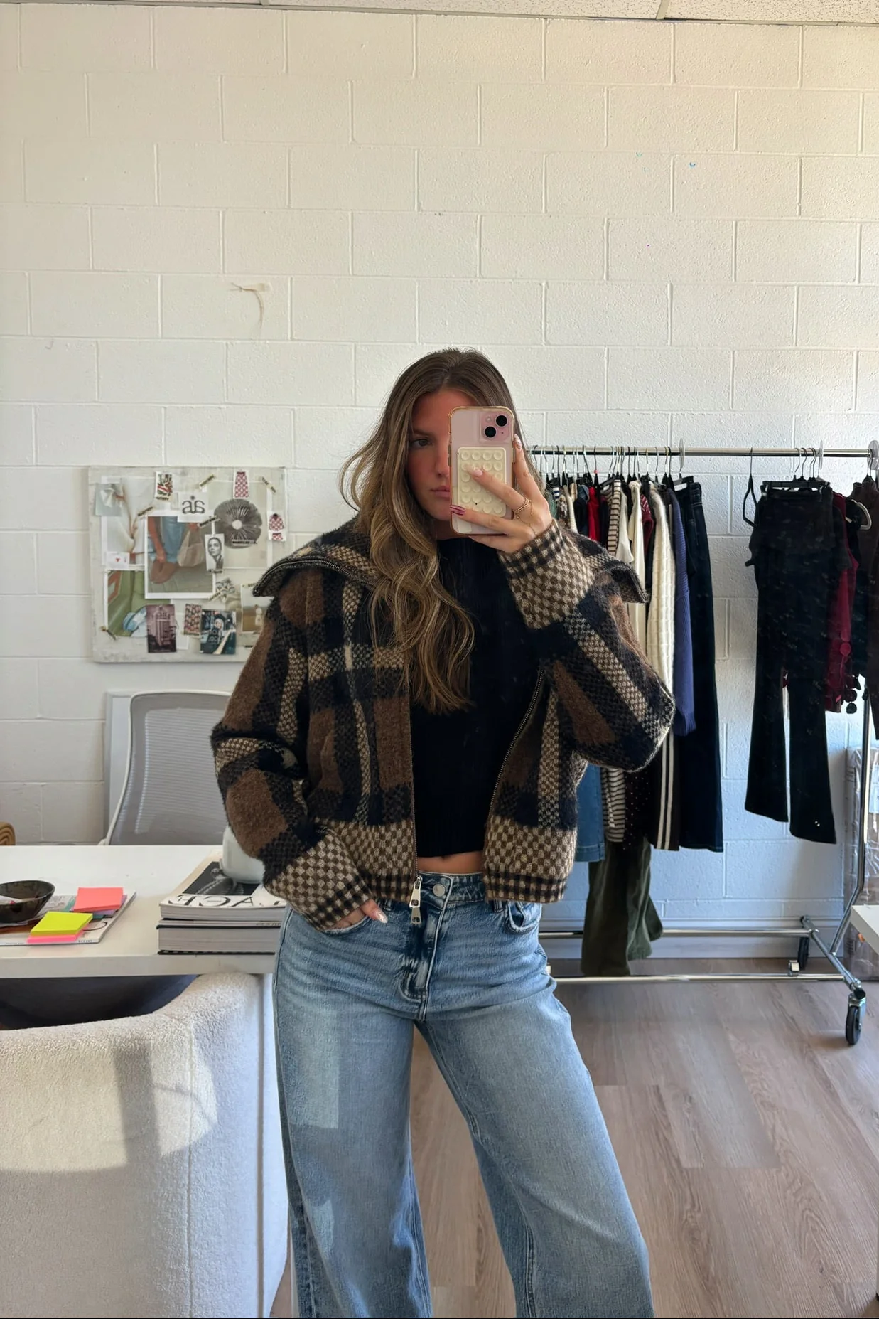 - Checkered plaid fuzzy jacket