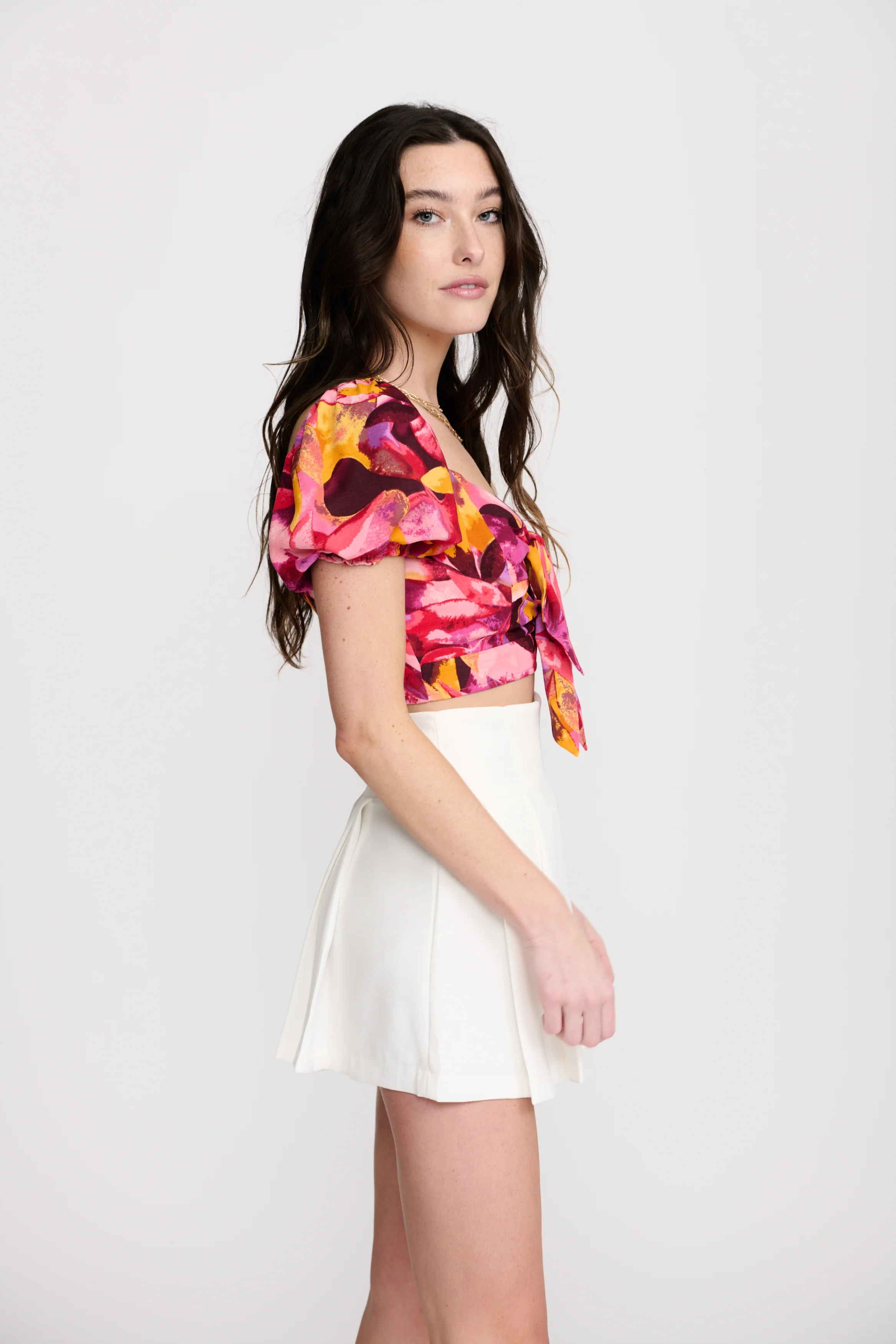 Get lost in a tropical oasis with this stunning bright and bold floral crop top. It features a sweetheart neckline with double ties to the front, cut out details and short puff sleeves. Style with a mini skirt and heels for a dressy outfit or pair with your favorite denim jeans.